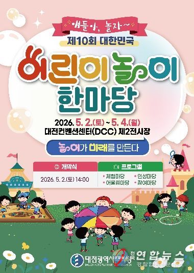 전국연합뉴스 기자 | 대전시교육청은 제104회 어린이날을 맞아 오는 5월 2일부터 4일까지 3일간 대전컨벤션센터(DCC) 제2전시장에서 ‘제10회 대한민국 어린이 놀이 한마당’을 개최한다고 밝혔다.