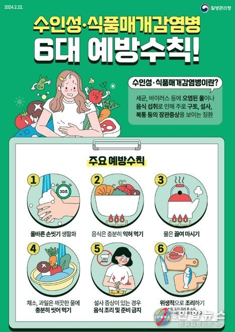 하절기 수인성·식품매개감염병 예방을 위해서는 ▲흐르는 물에 30초 이상 비누로 올바르게 손 씻기 ▲음식은 충분히 익혀 먹기 ▲채소, 과일은 깨끗한 물에 충분히 씻어 먹기 ▲위생적으로 조리하고 설사 증상이 있는 경우 조리에 참여하지 않기 ▲생선·고기·채소 도마 분리 사용 등 예방 수칙을 준수해야 한다.