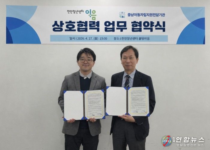 전국연합뉴스 김대환 기자 | 천안시는 천안청년센터 이음이 27일 충남아동자립지원전담기관과 ‘취약계층 청년 발굴 및 통합 지원을 위한 업무협약’을 체결했다고 밝혔다.