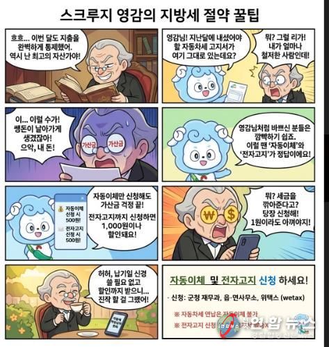 전국연합뉴스 김용태 기자 | 청양군이 스마트폰 환경에 익숙한 군민들을 위해 친숙한 캐릭터를 활용한 웹툰 ‘스크루지 영감의 지방세 절세 꿀팁’을 제작하고, 자동이체 및 전자고지 신청 독려에 나섰다.
