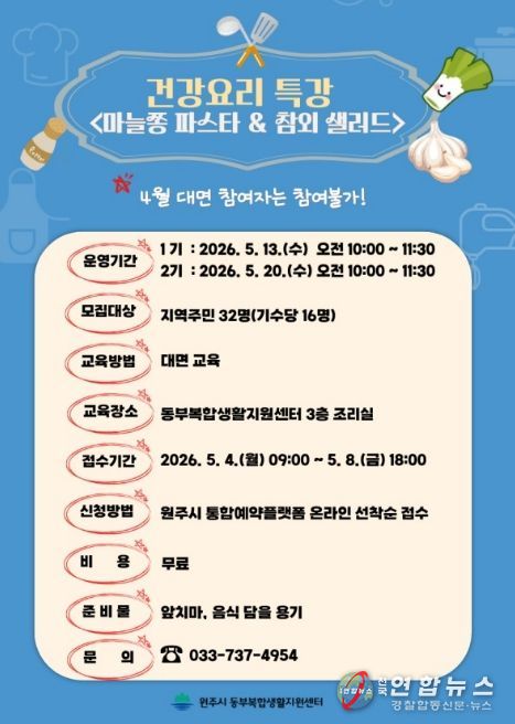 전국연합뉴스 유근택 기자 | 원주시 동부복합생활지원센터는 다음 달 4일부터 ‘마늘쫑 파스타·참외 샐러드 만들기’ 건강 요리 특강 프로그램 참여자를 모집한다.