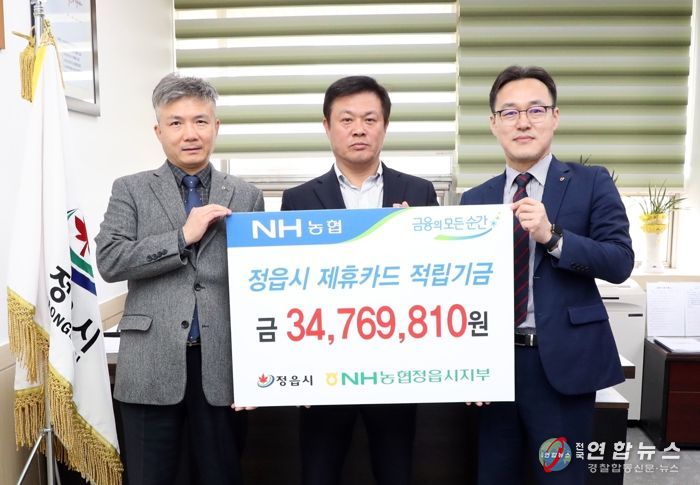 전국연합뉴스 최성용 기자 | NH농협은행 정읍시지부는 7일 정읍시에 제휴카드 사용에 따른 지역 발전 적립기금 3,476만 원을 전달했다.