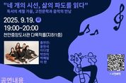 전국연합뉴스 김대환 기자 | 천안중앙도서관은 오는 9월 19일 찾아가는 북콘서트 ‘네 개의 시선, 삶의 파도를 읽다’를 개최한다고 밝혔다. 이번 북콘서트는 문학과 음악을 함께 향유할 수 있도록 고전문학을 음악으로 풀어내 책이 지닌 감동을 극대화한다. 특히 세계적으로 사랑받는 고전 작품인 ▲어린왕자 ▲죽은 왕녀를 위한 파반느 ▲노인과 바다 ▲달과 6펜스 등을 음악으로 재해석해 선보인다. 행사 참여는 천안중앙도서관 누리집을 통해 신청 가능하며, 자세한 사항은 천안중앙도서관 도서관본부로 문의하면 된다. 도서관 관계자는 “이번 북콘서트는 고전을 친숙하고 새로운 방식으로 만날 수 있는 기회가 될 것”이라며 “책을 읽는 귀와 음악을 듣는 눈이라는 색다른 경험을 통해 시민들이 문화적 감동을 나눌 수 있기를 바란다”고 말했다.