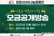 전국연합뉴스 김대환 기자 | (재)천안시복지재단은 내달 3일 희망2026나눔캠페인 공개모금행사 ‘나눔으로 하나되는 따뜻한 천안’을 연다고 28일 밝혔다. 천안시·천안시복지재단·충남사회복지공동모금회가 함께하는 이번 행사는 시청 로비에서 오전 10시부터 12시까지 진행되며, 유튜브를 통해 생중계될 예정이다. 기부는 재단 연합모금계좌로 참여할 수 있으며, 기부자는 세액공제 혜택을 받을 수 있다. 행사를 통해 모금된 성금은 위기가정의 생계비 및 의료비 지원 등 사회적 안전망 강화와 복지기관의 다양한 복지사업에 사용될 예정이다. 재단은 충남사회복지공동모금회와 함께하는 집중모금 기간인 내년 1월 31일까지 시민들의 나눔 참여가 이뤄질 수 있도록 독려할 계획이다. 이운형 천안시복지재단 이사장은 “어느 때보다 경기침체로 힘든 상황이지만 이럴 때 일수록 소외된 이웃을 돌아보고, 나눔 문화 확산에 함께해 주시길 바란다”고 말했다.