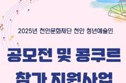 전국연합뉴스 김대환 기자 | 천안문화재단은 내달 3~ 5일까지 ‘천안 청년예술인 공모전 및 콩쿠르 참가 지원사업’ 참여자를 모집한다고 15일 밝혔다. 재단은 청년예술인의 문화예술 활동 영역을 확장하고 지원하기 위해 올해부터 공모전과 콩쿠르 참가 활동비 지원사업을 추진하게 됐다. 지원 대상은 천안시에 거주하거나 천안시 소재의 대학교 예술학과 재학 또는 졸업한 만 19세 이상 만 39세 이하의 청년예술인으로, 3년 이상 예술활동 실적이 있으면 신청할 수 있다. 신청은 재단 누리집에서 신청서를 내려받아 작성 후 증빙 서류와 함께 전자우편으로 제출하면 된다. 선정 결과는 심의를 거쳐 내달 19일 재단 누리집에 공지할 예정이다. 자세한 사항은 재단 누리집을 참고하거나 전화로 문의하면 된다.