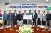 전국연합뉴스 김생수 기자 | 지속되는 가뭄으로 어려움을 겪고 있는 강릉시에 가뭄 위기 극복을 기원하는 성금 및 후원 기탁이 이어지고 있다. 원주시는 22일 강릉시를 직접 찾아 생수 500㎖ 120,000병(금8,400만 원 상당)을 지원했다. 후원품은 원주시와 원주 아너소사이어티 회원 7명의 지원으로 확보됐다. (사)스마일강릉도 22일 열린 가뭄극복 시민설명회에서 강릉시에 ‘가뭄 극복 생수 나눔 성금’ 1,000만 원을 기탁했다. 김홍규 강릉시장은 “어려울 때 손 내밀어주신 분들의 따뜻한 마음에 깊은 감사의 마음을 전한다.”고 전했다.