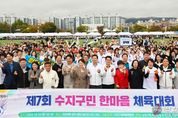전국연합뉴스 박남호 기자 | 용인특례시 수지구는 18일 아르피아 상부 체육시설에서 ‘제7회 수지구민 한마음 체육대회’를 개최했다. 수지구 체육연합회가 주최·주관한 이번 대회엔 구민 약 2000여 명이 참여해 승부차기, 볼풀공 바구니농구, 줄다리기, 계주 등으로 구민 모두 한마음으로 어우러지는 시간을 보냈다. 또 식전 공연인 동천동 훌라댄스, 신봉동 밸리댄스와 단국대학교 치어리딩팀 ‘아스테르’의 공연, 퓨전 장구, 보컬그룹 ‘뮤랑’, 마술사 홍승인, 초대 가수 김성환 등이 다채로운 무대를 선보였다. 행사장 곳곳에선 화분 만들기, 친환경 리필스테이션(세제 담아가기), MBTI 검사, 캘리그라피 체험, 키링 만들기, 구민 건강 서비스 안내 부스 등 체험 프로그램이 운영됐다. 이상일 시장은 “우리 수지구민들이 모처럼 한자리에 모여 우정을 나누면서 행사를 통해 행복한 시간을 많이 보내시라고 비가 그친 것 같다”며 “수지중앙공원은 축구장 76개 크기의 시민 힐링 공간으로 조성되고 있고, 상현3동 행정복지센터와 함게 건립되는 광교스포츠센터에는 25m레인 10개의 수영장이 들어서게 된다"며 "서울종합운동장역과 수