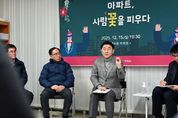 전국연합뉴스 박점규 기자 | 의정부시는 12월 15일 SK뷰아파트에서 입주자대표회의 임원과 입주민 20여 명이 참석한 가운데 ‘2025년 찾아가는 U아파트 상담실_아파트, 사람꽃을 피우다’를 개최했다. 이번 간담회는 시민의 생활불편 사항을 현장에서 직접 듣고 해결 방안을 함께 모색하기 위해 마련했다. 간담회에서 주민들은 지역 내 체육시설 부족 문제를 지적하며, 노인을 위한 파크골프장과 주민들이 함께 이용할 수 있는 체육시설 건립을 요청했다. 또한 교외선 활성화를 위한 역사 신설, 초등학교 주변의 무단 쓰레기 문제, 신촌로 도로 균열 보수, 버스노선 확충 및 정류장 내 난방의자 설치 등 실질적인 생활환경 개선 사항들도 건의했다. 김동근 시장은 GTX-C 노선 개통과 연계한 광역환승센터 조성, 재건축‧재개발을 통한 주거환경 정비 및 교육환경 개선 방안, 시민레저스포츠타운 조성 등 시의 주요 추진계획을 설명하며, 주민들과 지역 발전 방향과 추진 일정에 대해 의견을 나눴다. 김동근 시장은 “찾아가는 U아파트 상담실은 시민의 의견을 직접 듣는 소통 창구”라며 “현장에서 수렴되는 다양한 의견을 관
