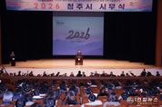 전국연합뉴스 이동수 기자 | 청주시는 2일 청주예술의전당 대공연장에서 2026년 시무식을 개최하고 새해 시정 운영의 힘찬 출발을 알렸다. 이날 시무식에는 이범석 청주시장, 신병대 부시장을 비롯한 시 직원들과 산하기관 관계자 등 1천200여명이 참석해 새해 각오를 다졌다. 행사 전에는 직원 간 담소 시간이 마련됐으며, 오전 9시부터 국민의례를 시작으로 시장 신년사, 시립예술단 공연, 신년 인사가 순서대로 진행됐다. 이범석 시장은 신년사에서 “민선8기 청주시가 지금까지 시민과 이룬 성장과 변화는 뿌리 깊은 나무가 되어 어떤 비바람에도 흔들리지 않는 밑거름이 됐다”면서 “그 기반을 바탕으로 2026년을 청주의 더 큰 미래와 번영을 향해 나아가는 ‘개화공영(開花共榮)’의 해를 만들겠다”고 밝혔다. 이어진 시립예술단 공연에서 합창단은 ‘우리가 청주다’ 곡을 선보이며 새해를 여는 희망의 메시지를 전했고, 시장과 간부 공무원들은 사무실로 향하는 전 직원과 신년 인사를 나누며 2026년 시정 목표 달성을 위한 의지를 다졌다. 한편, 청주시는 2026년 화두로 개화공영을 선정했다. 민선 8