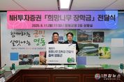 전국연합뉴스 이동수 기자 | 충북 영동군은 11일 NH투자증권이 영동군에 ‘희망나무 장학금’ 1,500만 원을 전달했다고 밝혔다. 이번 장학금은 군을 통해 관내 저소득층 중·고등학생 10명에게 지원될 예정이다. 이날 오전 영동군청 상황실에서 열린 전달식에는 임철순 NH투자증권 ESG본부장과 정영철 영동군수를 비롯한 관계자들이 참석했다. NH투자증권은 지난 2005년부터 농촌지역 저소득 가정의 중·고등학생 40여 명을 선발해 장학금을 지원해왔다. 올해부터는 더 많은 학생을 지원하기 위해 농촌지역 지자체별로 10명의 중·고등학생을 선정해 장학금을 전달하고 있다. 올해는 총 5개 지자체에서 지원하며, 영동군은 그중 하나로 선정됐다. 내년부터는 지원 지자체를 8곳으로 확대할 계획이라고 밝혔다. NH투자증권은 장학사업뿐 아니라 농촌 취약계층 지원, 지역사회 발전사업, 환경보호 활동 등 폭넓은 사회 공헌을 이어가고 있다. 임철순 본부장은 “희망나무 장학금은 농촌지역 학생들이 꿈을 포기하지 않고 미래를 향해 나아가도록 돕는 뜻깊은 사업”이라며 “앞으로도 교육 복지 향상과 지역 인재 육성