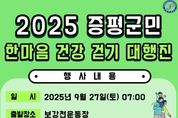 전국연합뉴스 이동수 기자 | ‘2025 증평군민 한마음 건강걷기대행진’이 오는 27일 오전 7시, 증평 보강천 운동장에서 열린다. 증평군체육회(회장 최재옥)가 주관하는 이번 행사는 군민의 건강 증진과 화합 도모, 가족 중심의 여가 문화 확산을 위해 마련됐다. 걷기 코스는 보강천 운동장을 출발해 천변공원, 김득신 다리, 무궁화길을 거치는 약 3.5km 구간이다. 경사가 완만하고 자연경관이 뛰어나 남녀노소 누구나 부담 없이 참여할 수 있는 코스로 구성됐다. 사전 신청 없이 군민 누구나 자유롭게 참여할 수 있으며, 참가자 전원에게 기념품이 제공되고 다양한 경품 추첨도 함께 마련된다. 체육회는 이번 걷기 대행진을 통해 군민이 함께 어우러지는 건강한 공동체 분위기를 조성하고, 삶의 질 향상에도 기여할 것으로 기대하고 있다. 최재옥 회장은 “보강천변의 아름다운 경관을 따라 가족, 친구들과 함께 걸으며 건강도 챙기고 즐거운 추억도 만드는 시간이 되길 바란다”며 “많은 군민들의 참여를 부탁드린다”고 말했다.