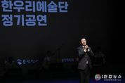 전국연합뉴스 기자 | 용인특례시는 5일 오후 수지구 용인평생학습관 큰어울마당에서 ‘한우리예술단 정기공연’이 열렸다고 6일 밝혔다. 용인특례시가 후원하고 용인민예총이 주최·주관한 이날 행사는 우리 고유의 가락과 춤을 한자리에서 만날 수 있는 전통 공연으로 꾸며졌고, 이상일 시장은 1시간 40분간 진행된 공연을 끝까지 지켜본 뒤 공연단을 격려했다. 공연은 농악, 민요, 가야금, 검무 등으로 우리 민족 고유의 소리와 정서, 삶의 이야기를 그려내 큰 박수갈채를 받았다. 할미성 농악 보존회는 꽹과리, 장구, 북, 징, 태평소 등의 악기를 활용해 역동적인 농악 판굿을 선보였다. 용인 아리랑 보존회는 청춘가, 태평가, 창부타령 등 흥겨운 경기민요를 열창하며 분위기를 이끌었다. 이어 검무가 남지연씨의 검무공연이 펼져졌다. 앙상블 더 가야금은 대중에게 친숙한 고향의 봄, 꽃타령, 까투리타령 등을 가야금 병창으로 들려주며 국악의 매력을 선사했다. 한우리예술단은 화려한 가락이 돋보이는 설장구로 타악의 진수를 보여줬다. 이상일 시장은 축사에서 “올해로 32회를 맞이한