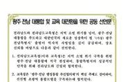 전국연합뉴스 기자 | 전라남도교육청과 전라남도가 광주·전남 대통합과 교육 대전환을 위한 공동선언문을 발표했다. 김대중 교육감과 김영록 지사는 8일 오전 전남도청에서 만나 최근 논의되고 있는 광주·전남 통합과 관련, “지역 소멸 위기를 넘어 광주·전남 대통합을 주도하고, 대한민국의 새로운 성장축이 될 ‘(가칭) 광주전남 특별시’ 출범이 역사적 사명임을 깊이 공감한다.”며 이같이 선언했다. 전남교육청은 4개 항으로 된 선언문에서 지역 소멸 위기 극복을 위한 광주·전남 대통합에 적극 찬성하며, 통합 특별시의 성공적인 안착을 위해 전남도와 긴밀히 협력하기로 했다. 이어, ‘광주·전남 행정통합 추진협의체’에 핵심 주체로 참여하여, 선진형 초광역 통합모델을 구축하는 데 협력하기로 했다. 또한, 전남교육청은 교육·학예 분야와 관련된 사항에 대해 광주광역시교육청과 함께 법안 작성 및 검토에 앞장서기로 했다. 이와 함께, 전남교육청과 전남도는 통합 과정에서 교육 현장의 목소리를 반영하며, 교육 현장이 체감할 수 있는 교육 대전환과 미래 인재 양성을 위해 모든 역량을 결집한다는 데 합의했다.