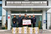 전국연합뉴스 김삿갓 기자 | 영주시는 지난 16일 ㈜예천친환경급식센터(대표 신규용)가 영주시청을 방문해 소면 300kg(81만 원 상당)을 기탁했다고 밝혔다. 이날 기탁식에는 ㈜예천친환경급식센터 신규용 대표와 유정근 영주시장 권한대행이 참석해 나눔의 의미를 함께 나누며 감사의 뜻을 전했다. 특히 이번 기부는 ‘희망2026 나눔캠페인’에 현물 기부로 참여한 것으로, 연말을 맞아 지역사회에 따뜻한 온기를 전하는 데 의미를 더했다. 이번에 기탁된 소면은 관내 경로식당과 장애인복지시설 등 지역 내 취약계층 이용 시설 16개소에 전달될 예정이다. 신규용 대표는 “연말을 맞아 지역 어르신들과 복지시설 이용자분들께 조금이나마 도움이 되고자 기탁을 결정했다”며, “앞으로도 지역과 함께 성장하는 기업으로서 지속적인 나눔 활동에 동참하겠다”고 말했다. 유정근 영주시장 권한대행은 “어려운 이웃을 위해 따뜻한 손길을 보내주신 ㈜예천친환경급식센터 신규용 대표께 깊이 감사드린다”며, “희망2026 나눔캠페인 참여를 통해 지역사회 전반에 따뜻한 연말 분위기 확산에 큰 힘이 되고 있다”고 밝혔다. 영주