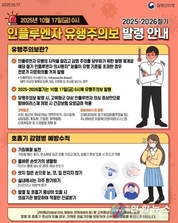 전국연합뉴스 조민준 기자 | 광명시는 최근 인플루엔자 환자가 빠르게 증가함에 따라 시민들에게 예방접종과 개인예방수칙 준수를 재차 당부했다. 28일 시에 따르면 올해 44주차(10월 26일~11월 1일)부터 47주차(11월 16~21일) 인플루엔자 의사환자 분율(인플루엔자 의사환자 수/총 진료 환자 수)은 외래환자 1천 명당 ▲22.8명 ▲50.7명 ▲66.3명 ▲70.9명으로 4주 연속 크게 상승했다. 올해 유행 시기가 예년보다 앞당겨지면서 지난 10월 17일 인플루엔자 유행주의보 발령 이후 감염 위험이 빠르게 높아지고 있다. 시는 특히 ▲소아 ▲임신부 ▲65세 이상 어르신 ▲면역저하자 등 고위험군은 가까운 위탁의료기관에서 신속히 접종을 받을 것을 권고했다. 또한 감염 확산을 줄이기 위해서는 손 씻기와 마스크 착용 등 기본적인 예방수칙을 지키고, 발열·기침 등 의심 증상이 있을 경우 즉시 의료기관을 방문해 진료받는 것이 바람직하다. 박선미 감염병관리과장은 “올해 인플루엔자 유행이 평년보다 빨라 주의가 더욱 필요한 시기”라며 “특히 고위험군은 서둘러 예방접종을 받고, 개인위생 수칙을 철저