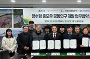 전국연합뉴스 최성용 기자 | 장수군은 장수한우지방공사, 이티바이오텍(주), 전북대학교와 장수군청 회의실에서 장수한우 품질 고급화를 위한 ‘장수형 저탄소 종모우 개발’ 공동연구 상호협력 업무협약(MOU)을 체결했다고 11일 밝혔다. 이번 협약은 협약기관 간 상호 업무협조 체계를 구축해 장수 한우 산업의 경쟁력을 높이기 위한 장수 지역 사양환경에 적합한 우수 유전자원을 확보하고, 탄소배출을 줄이면서도 생산성과 품질을 높일 수 있는 종모우 개발을 위해 마련됐다. 특히 종모우 개발을 통해 장수 한우 고유의 유전형질을 확립하고 탄소배출 저감과 생산성 향상을 동시에 달성하는 것이 핵심 목표다. 협약에 따라 군은 저탄소 종모우 개발을 위한 사업 총괄 및 행·재정적 지원을 하고 장수한우지방공사는 채정·가공·사양관리와 농가 컨설팅에 나선다. 또한 이티바이오텍은 유전체 기반 연구개발을 진행하고 전북대학교는 유전 능력 평가와 우량 암소·후보 종모우 선발을 각각 담당한다. 장수군은 이번 공동연구를 최근 지정된 전북특별자치도 농생명산업지구 내 ‘저탄소한우 산업지구’ 조성사업과 연계해 2030년까지 단계적으로
