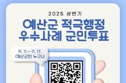 전국연합뉴스 김용태 기자 | 예산군은 2025년 상반기 적극행정 우수공무원 선발을 위해 오는 11일부터 17일까지 7일간 온라인 군민투표를 실시한다고 밝혔다. 군은 적극적인 업무 추진으로 공공의 이익 증진에 기여하고 공직사회 내 적극행정 문화 확산을 위해 매년 상·하반기 적극행정 우수공무원을 선발하고 있다. 군민투표는 1차 내부 실무평가단 심사를 통과한 적극행정 사례 5건을 대상으로 진행되며, 정보무늬(QR코드) 접속 또는 군 누리집 ‘군민참여→설문조사’ 코너에서 본인 인증 후 참여할 수 있다. 군은 실무심사 점수와 적극행정위원회 심사 점수를 합산해 11월 중 우수공무원을 최종 선발할 계획이며, 특히 이번 선발부터는 인사상 우대 조치와 함께 포상금도 지급된다. 예산군수는 “군민의 목소리를 직접 듣고 적극행정 활성화를 도모할 수 있도록 이번 군민투표에 많은 관심과 참여를 바란다”고 당부했다.