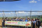 전국연합뉴스 김용태 기자 | 당진시농업기술센터는 지난 25일 관내 사과 농가 및 희망자를 대상으로 미래형 사과 다축 재배 기술 이론 및 현장 교육을 추진했다고 26일 밝혔다. 이번 교육은 정혜웅 교수(충남농업마이스터대학)를 초빙해 사과 다축 재배의 원리, 재식 거리, 전정 및 시비 관리 등 주제로 이론 교육을 하고, 충남 미래형 다축 사과원 조성 기술지원 사업으로 조성된 사과 다축 과원에서 현장 교육을 진행했다. 사과 다축수형의 가지 유인, 수체 관리 등 평소 농가들이 궁금해 왔던 질의응답 및 농가 애로사항을 듣고 해결 방안을 제시하는 등 생생한 현장 교육이 진행돼 농가들로부터 호응을 얻었다. 사과 다축수형은 최근 주목받고 있는 미래형 수형이다. 세장방추형 등 기존 수형과는 달리 하나의 대목에 원줄기를 2개 이상 유인해 재배하는 방법으로 생산성 향상, 노동력 절감 등 미래형 과원으로 주목받고 있다. 현재 당진시는 사과 다축과원 20 농가(총 10ha)가 조성돼 있으며, 시는 지역 특화작목 육성의 일환으로 2030년까지 30ha 이상 조성할 계획이라고 밝혔다. 더불어 사과 재배 기술의 상