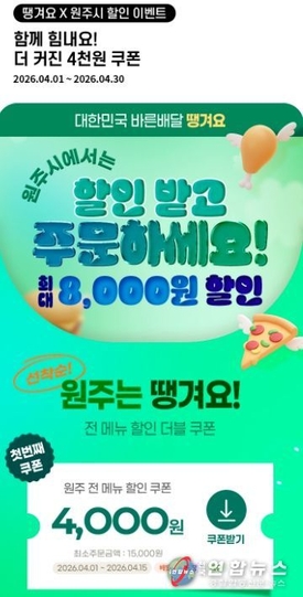 원주시, 상생배달앱 '땡겨요' 할인쿠폰 지원 확대