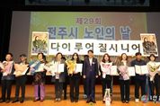 전국연합뉴스 최성용 기자 | 100세 시대를 맞아 전주지역 노인들의 행복하고 건강한 노후생활을 함께 염원하는 노인의날 기념식이 열렸다. 전주시와 대한노인회 전주시지회(지회장 홍성언)는 14일 전주학생교육문화관 공연장에서 우범기 전주시장과 최주만 전주시의회 부의장, 김두봉 대한노인회 전북특별자치도연합회장, 표창 수상자 등 1200여 명이 참석한 가운데 ‘제29회 전주시 노인의날 기념식’을 가졌다. 송민주 대한노인회 전주시지회 사무국장의 사회로 진행된 이날 기념식은 △무지개예술자원봉사단(단장 고대현)과 아름다운 실버 전주의꽃(단장 김인식)의 식전 공연 △노인 강령 낭독 △청려장(장수지팡이) 수여 △전주시장 및 전주시의장 표창 수여식 △노인복지공로자에 대한 공로장 수여식 등의 순으로 진행됐다. 특히 우범기 전주시장은 이날 기념식에서 올해 100세를 맞이한 김옥순 어르신(여, 덕진동)에게 무병장수의 상징인 청려지팡이를 전달했으며, 홍성언 지회장은 축하의 꽃다발을 선물했다. 홍성언 대한노인회 전주시지회장은 “풍성했던 한가위도 지나가고, 땀과 노력으로 이뤄낸 결실의 계절 가을을 맞이해 참석해 주신 우범기 전