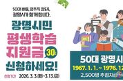 전국연합뉴스 조민준 기자 | 광명시가 50대 중장년 시민의 배움 기본권 보장을 위해 올해도 평생학습지원금 지원을 이어간다. 시는 오는 3월 3일부터 13일까지 11일간 ‘2026년 광명시민 평생학습지원금’ 신청을 받는다고 26일 밝혔다. 광명시민 평생학습지원금은 생애 전환기를 맞은 50대 시민이 나이·소득·배경과 관계없이 배움을 지속할 수 있도록 생애 1회 1인당 30만 원의 평생학습이용포인트를 지원하는 사업이다. 시민 스스로 자신의 삶과 필요에 맞는 학습을 선택하도록 돕는 것이 핵심 목적이다. 박승원 광명시장은 “배움은 선택이 아닌 누구에게나 보장돼야 할 기본권”이라며 “시민이 나이나 환경의 제약 없이 언제든지 배움을 이어갈 수 있도록 평생학습 기반을 더욱 탄탄히 만들어가겠다”고 밝혔다. 신청 대상은 1967년 1월 1일부터 1976년 12월 31일 사이에 출생한 50대 광명시민이다. 광명시에 1년 이상 계속 거주했거나, 거주기간을 합산해 5년 이상 거주하고 있어야 한다. 시는 총 2천500명을 선정해 지원한다. 59세(1967년생)는 올해가 마지막 지원 대상임을 고려해 우선 선정하고