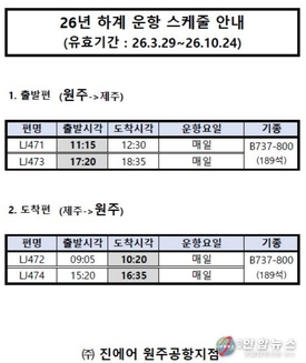 원주공항 하계 제주 항공편, 오전·오후 편성 유지