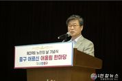 전국연합뉴스 김재업 기자 | 서울 중구가 제29회 노인의 날(10월 2일)을 기념해 지난 2일 중구 구민회관 대강당에서 기념식과 함께 어르신 어울림 한마당을 열었다. 이날 행사에는 어르신과 내빈 등 500여 명이 참석해 어르신들에 대한 노고에 존경과 감사를 표했다. 1부에서는 노인 복지와 지역 발전을 위해 헌신하신 65세 이상 모범어르신 3명과 노인복지 기여자 9명, 기여 단체 1곳에 표창이 수여됐다. 2부 행사에서는 초대가수 축하공연과 어르신 장기자랑이 펼쳐졌다. 어르신으로 구성된 11팀이 무대에 올라 노래와 악기 연주 실력을 뽐내며 흥겨운 시간을 만들었다. 김 구청장도 '고맙소'라는 노래를 불러 어르신들의 호응을 얻었다. 행사장 로비에는 영양 건강 체험 부스가 마련되어 어르신들이 드신 식사의 칼로리와 나트륨양 등을 직접 계산해보고 균형잡힌 식사법에 대한 상담도 받을수 있었으며, 추척사진관 부스에서는 교복을 입고 사진을 찍으며 옛 추억을 떠올렸다. 행사에는 한국삭도공업주식회사, 대신자산신탁, 한마음라이온스, 중구자원봉사센터를 비롯한 여러 업체와 기관이 경품, 기념품, 간식 등을 후원해 더욱 풍성하