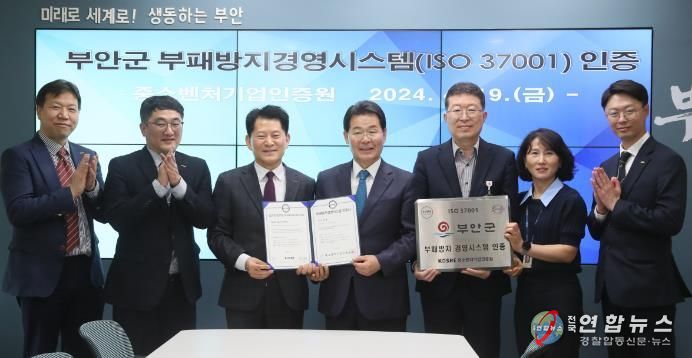 전국연합뉴스 최성용 기자 | 부안군이 전북특별자치도 지방자치단체 중 최초로 부패방지경영시스템(ISO 37001)을 도입하여 중소벤처기업인증원(원장 엄진엽)으로부터 인증을 획득했다.