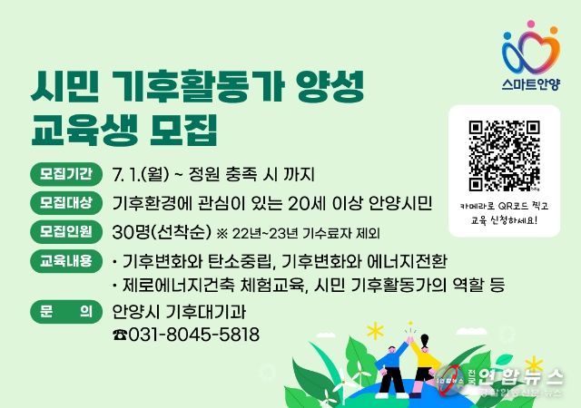 전국연합뉴스 이명후 기자 | 안양시가 탄소중립 실현을 이끌어 갈‘시민 기후활동가’를 양성하고자 전문 교육(양성교육)을 추진하고 참여자 30명을 선착순으로 모집 중이라고 2일 밝혔다.