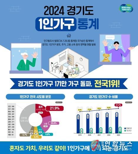 전국연합뉴스 조민준 기자 | 경기도 1인가구는 171만 가구이며, 도 전체 가구 가운데 31.2%를 차지하고 있는 것으로 나타났다. 경기도의 1인가구 수는 2020년부터 매년 전국 최고치를 경신하고 있다.