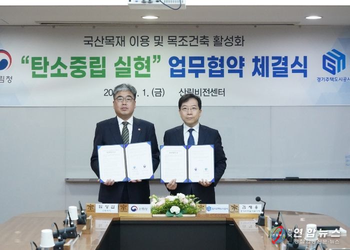 전국연합뉴스 조민준 기자 | 경기주택도시공사(GH)와 산림청은 1일 서울 여의도 산림비전센터에서 국산 목재 이용 및 목조 건축 활성화를 위한 업무협약(MOU)을 체결했다.