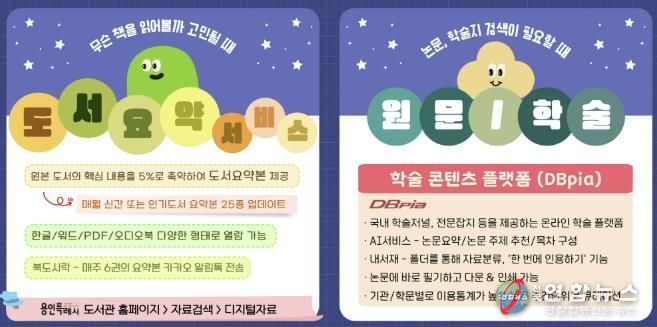 전국연합뉴스 배주현 기자 | 용인특례시는 언제 어디서나 쉽게 도서 정보를 이용할 수 있는 ‘도서 요약 서비스’와 ‘학술 콘텐츠 원문 제공 서비스’를 올해부터 실시한다고 3일 밝혔다.