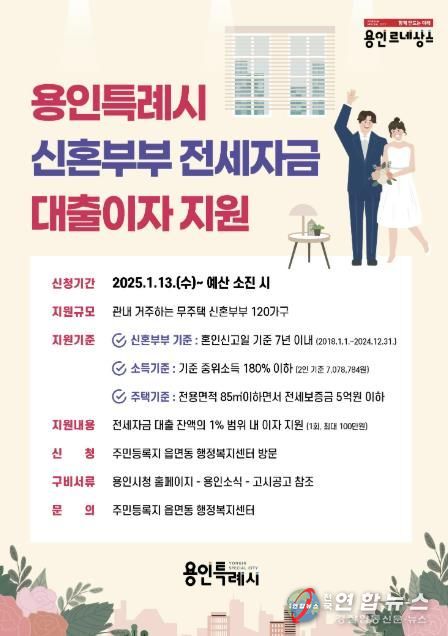 전국연합뉴스 배주현 기자 | 용인특례시는 결혼한 지 7년 이내 무주택 신혼부부의 주거 안정을 돕기 위해 최대 100만원의 전세자금 대출이자를 지원키로 하고 13일부터 31일까지 총 120쌍을 모집한다고 9일 밝혔다.