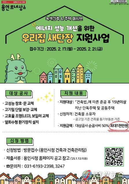 전국연합뉴스 배주현 기자 | 용인특례시는 노후주택의 단열 성능을 높여 에너지 소비를 줄이고 주거 환경을 쾌적하게 개선하기 위한 ‘우리집 새단장 지원사업’에 총 2억 5000만원을 투입한다고 13일 밝혔다.