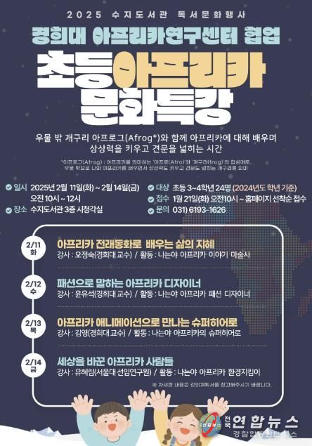 전국연합뉴스 배주현 기자 | 용인특례시 수지도서관은 2월 11일부터 수지도서관 3층 시청각실에서 경희대 아프리카 연구센터와 협업해 아프리카 역사·문화에 대해 배우는 ’아프로그(Afrog) 문화특강‘을 운영한다고 20일 밝혔다.