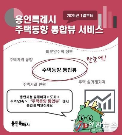 전국연합뉴스 배주현 기자 | 용인특례시는 이달부터 시민들이 관내 주택거래 관련 정보 등을 편리하게 파악할 수 있도록 ‘용인특례시 주택동향 통합뷰’ 서비스를 시작한다고 21일 밝혔다.