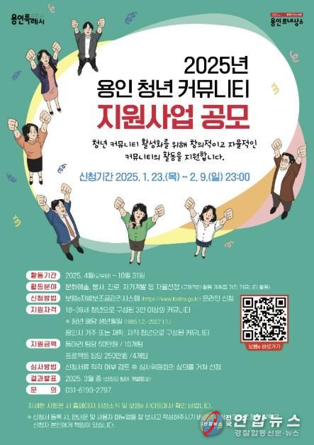 전국연합뉴스 배주현 기자 | 용인특례시는 ‘2025년 용인 청년 커뮤니티 지원사업’에 참여할 14개 팀을 모집한다고 24일 밝혔다.