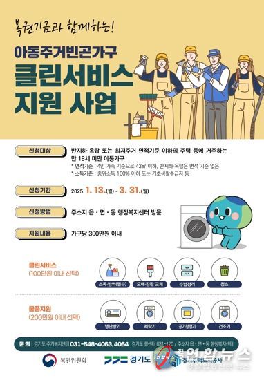 전국연합뉴스 배주현 기자 | 용인특례시는 아동을 둔 저소득 가구를 대상으로 주거환경과 위생개선을 지원하는 ‘복권 기금과 함께하는 아동주거빈곤가구 클린 서비스’ 사업대상자를 모집한다고 30일 밝혔다.