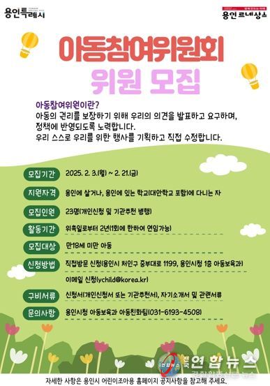전국연합뉴스 배주현 기자 | 용인특례시는 이달 1일부터 21일까지 아동 정책 수립 과정에 직접 참여할 ‘제7기 아동참여위원회’ 위원 23명을 모집한다고 2일 밝혔다.
