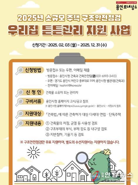 전국연합뉴스 배주현 기자 | 용인특례시는 전국 최초로 일부 소규모 노후주택에 지원했던 무료 안전 점검을 모든 소규모 주택으로 확대 지원하는 ‘우리집 튼튼관리 지원 사업’을 시작했다고 4일 밝혔다.