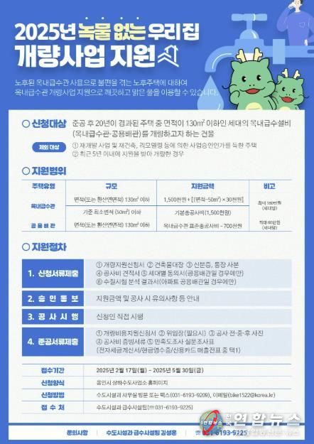 신청 기간은 오는 17일부터 5월 30일까지다. 수도관 개량 지원을 받으려면 용인시상하수도사업소 홈페이지에서 신청서를 내려받아 구비 서류와 함께 시 수도시설과(용인특례시 처인구 금령로 50)를 방문해 제출하거나 전자우편이나 팩스로도 접수하면 된다.