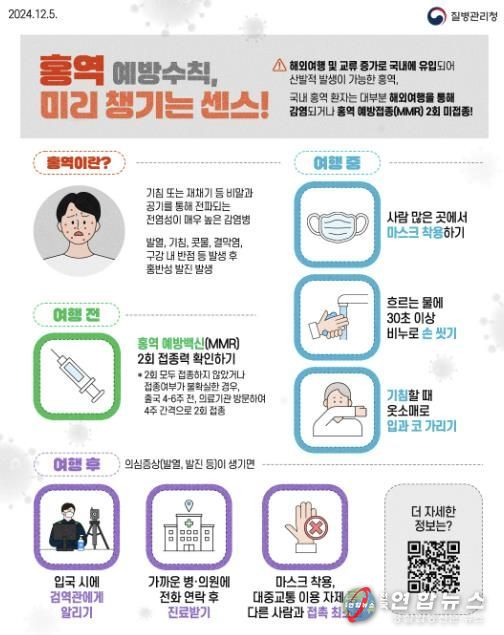 홍역은 전염성이 높은 호흡기 감염병으로 기침이나 재채기로 공기 중 전파된다. 감염되면 발열, 발진, 구강 내 회백색 반점 등 증상이 나타난다. 면역이 불충분하면 홍역 환자와 접촉했을 때 감염될 가능성이 90%를 넘지만, 백신 접종으로 예방할 수 있기 때문에 생후 12~15개월, 4~6세 아동은 반드시 접종해야 한다. 접종 관련 문의는 관할 보건소로 하면 된다.