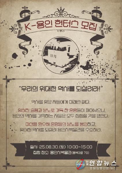 전국연합뉴스 박남호 기자 | 용인특례시는 30일 오전 10시부터 오후 3시까지 용인시박물관에서 문화체험 행사 ‘K-용인 헌터즈 : 조상의 분노를 봉인하라’를 개최한다고 26일 밝혔다.