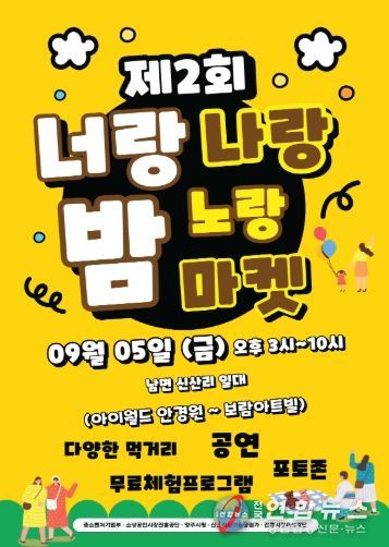 전국연합뉴스 박점규 기자 | 양주시와 신산시장마을번영회가 주관하는 ‘너랑나랑노랑 밤 마켓’이 오는 9월 5일 오후 3시부터 밤 10시까지 남면 개나리길 74 일원에서 열린다.