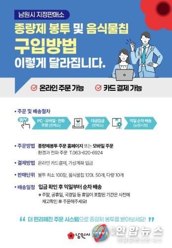 전국연합뉴스 최성용 기자 | 남원시는 종량제봉투의 재고·주문·판매 전 과정을 전산화하고, 지정판매소 대상 온라인 주문 및 카드결제 서비스를 본격 도입한다고 밝혔다.