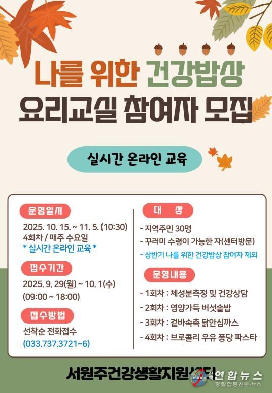 전국연합뉴스 유근택 기자 | 서원주건강생활지원센터는 지역 주민의 올바른 식습관 형성과 대사증후군 예방·관리를 돕기 위해 ‘나를 위한 건강밥상 요리교실’ 프로그램 참여자를 모집한다.