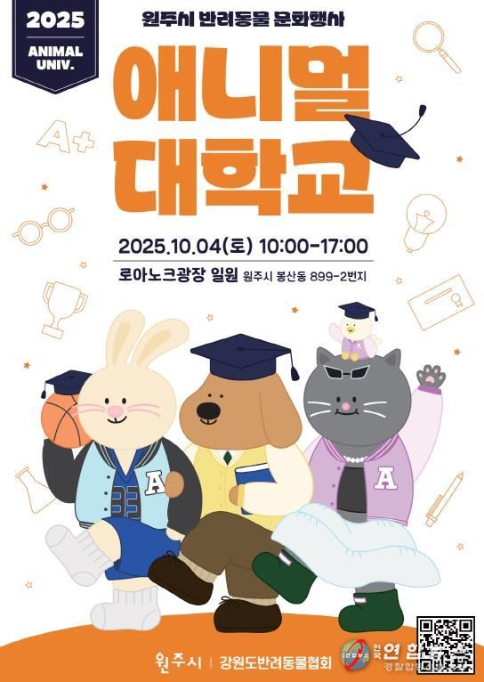 전국연합뉴스 유근택 기자 | 원주시농업기술센터는 10월 4일 오전 10시 원주천 로아노크광장에서 반려동물 문화행사 ‘애니멀 대학교’를 개최한다.