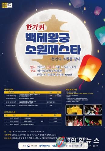 익산시는 추석 전날인 오는 10월 5일에 유네스코 세계유산 백제왕궁(왕궁리 유적)에서 '한가위 백제왕궁 소원페스타 : 천년의 소원을 담다'를 개최한다고 25일 밝혔다.