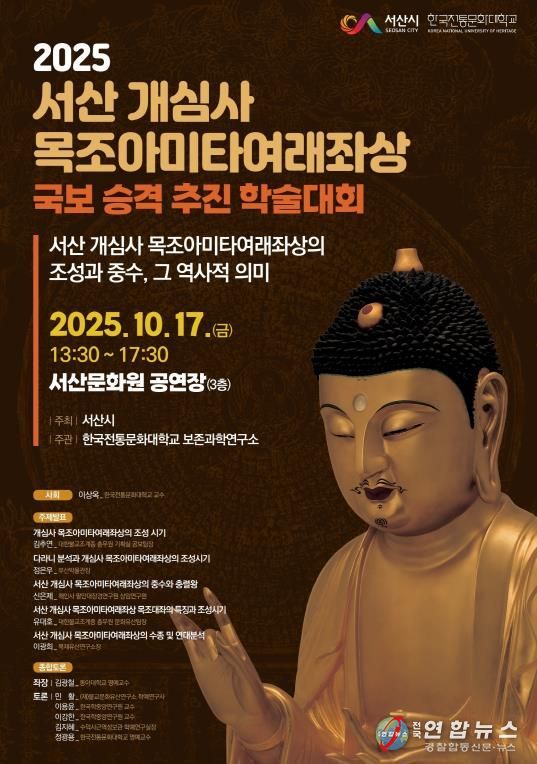 전국연합뉴스 김용태 기자 | 충남 서산시는 개심사 목조아미타여래좌상의 국보 승격을 위한 학술대회를 오는 17일 오후 1시 30분 서산문화원에서 개최한다고 밝혔다.