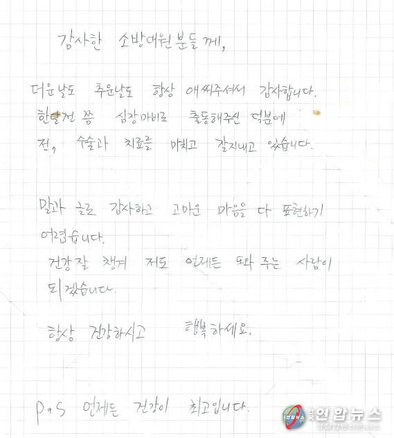김원형 구급대원은 “당연히 해야 할 일을 했을 뿐인데 이렇게 감사 인사를 받아 오히려 부끄럽다”며 “A씨가 건강을 회복하고 퇴원하셨다는 소식을 들으니 뿌듯하다”고 말했다.
